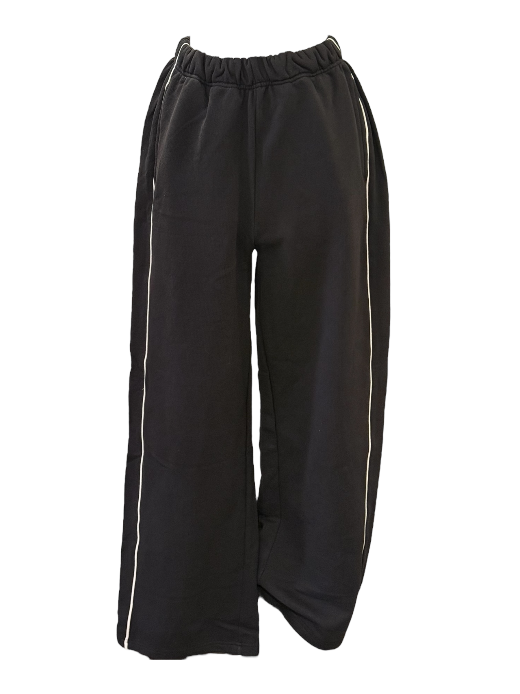 100% COTTON TERRY CONTRAST LINE WIDE SWEATPANT. these wide pants with contrast piping on the sides bring a sporty edge to your casual wardrobe. The sleek contrast detailing along the legs adds a dynamic, athletic vibe while keeping the overall design clean and minimalist. With a relaxed, wide-leg fit and side pockets for practicality, these pants offer both comfort and style. Perfect for an active day or a laid-back outing, they effortlessly blend sporty influences with casual ease.
