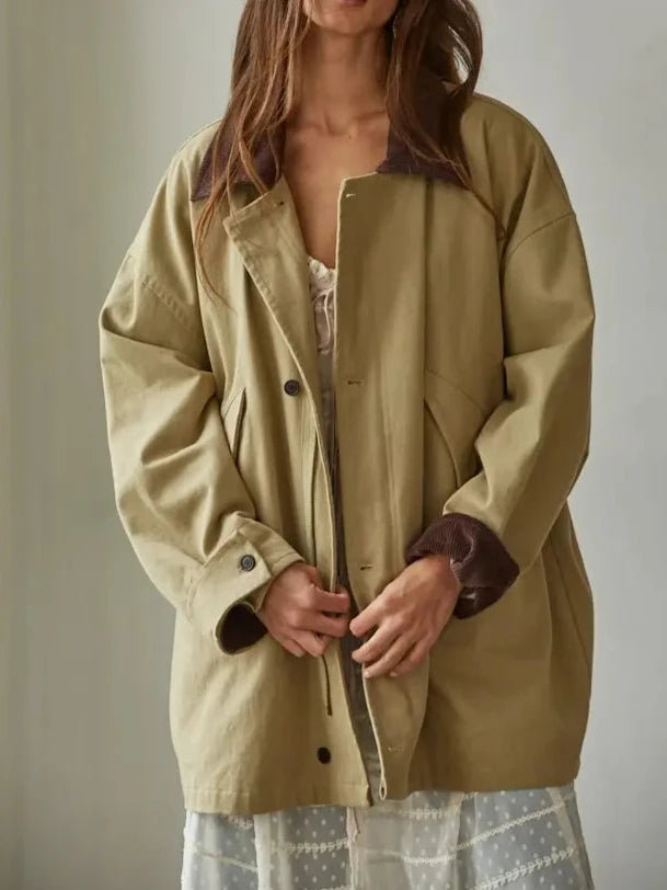 Woven Cotton Contrast Corduroy Collar Neck Long Sleeve with Corduroy Inner Detail Loose Fit Utility Jacket with Front Pockets, Front Buttons, Inside Zipper and Polyester Lining.