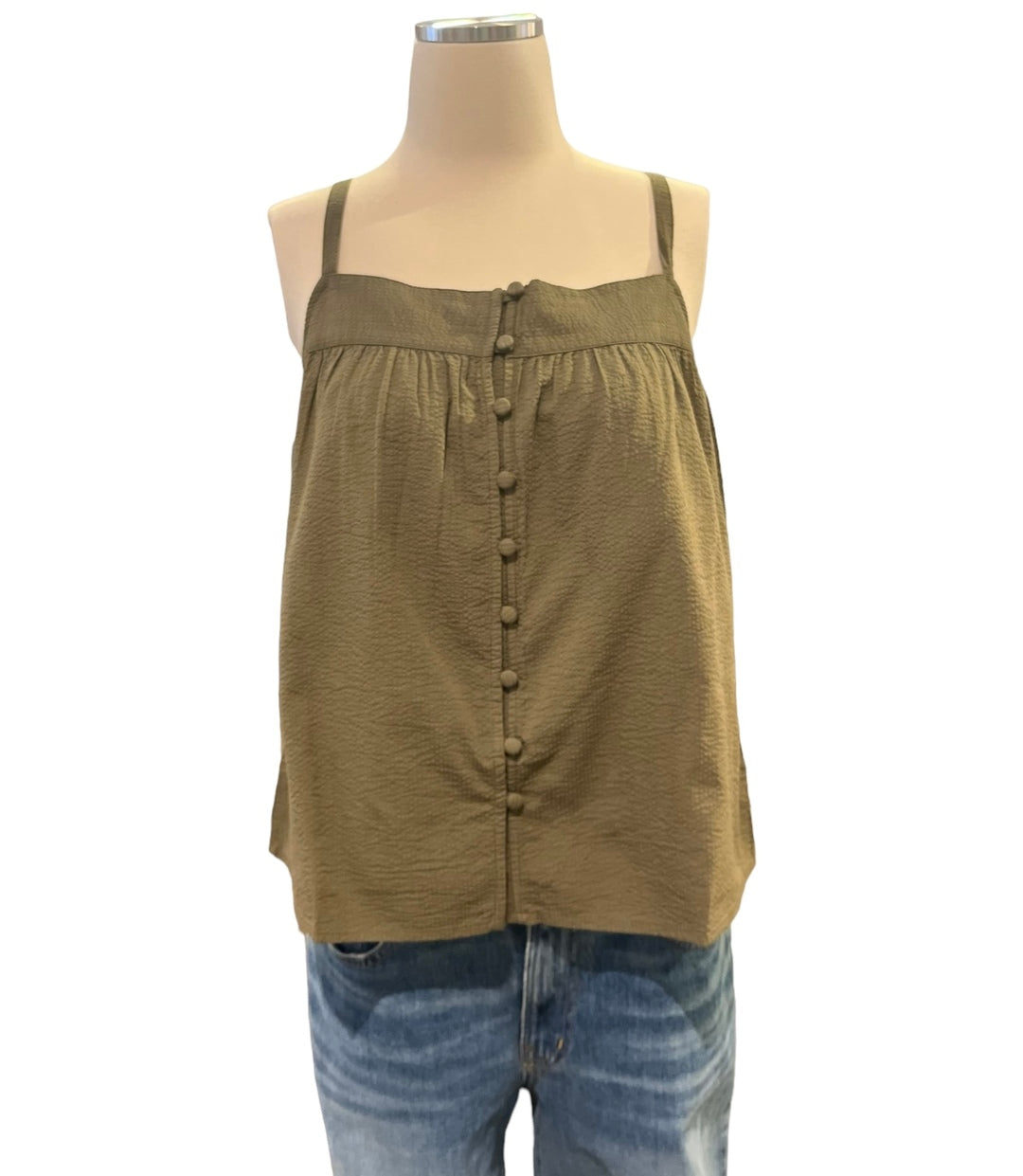 This button-front tank by Faherty is a sweet and summery staple, featuring adjustable straps, covered buttons, and silky seersucker fabric in an organic cotton blend. The flowy fit is perfect for tucking into jeans, cutoffs, or wide leg pants. DETAILS Neckline : Square Neck MEASUREMENTS Length from Shoulder to Hem: 22 1/2" MATERIALS & CARE Material: 74% Organic Cotton, 26% Modal Seersucker Sustainable practices: Made with 74% organic cotton Care: Machine Wash, Wash Cold, Wash Inside Out