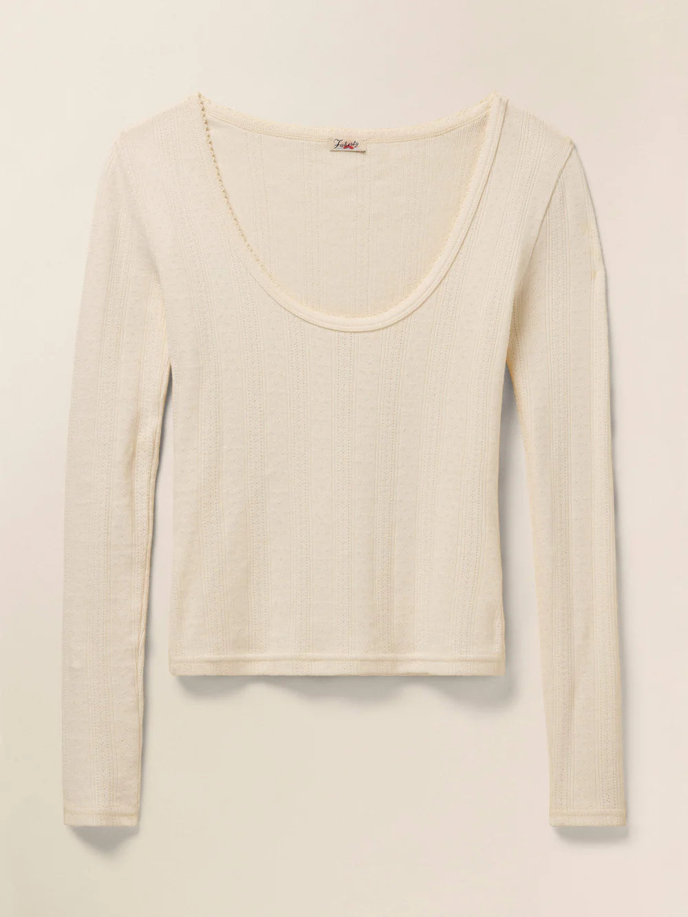 Crafted in Peru and made from the softest 100% organic cotton, the Pacific Pointelle Top features a scoop neckline, full-length sleeves, and a fitted silhouette. Finished with delicate lace trims.