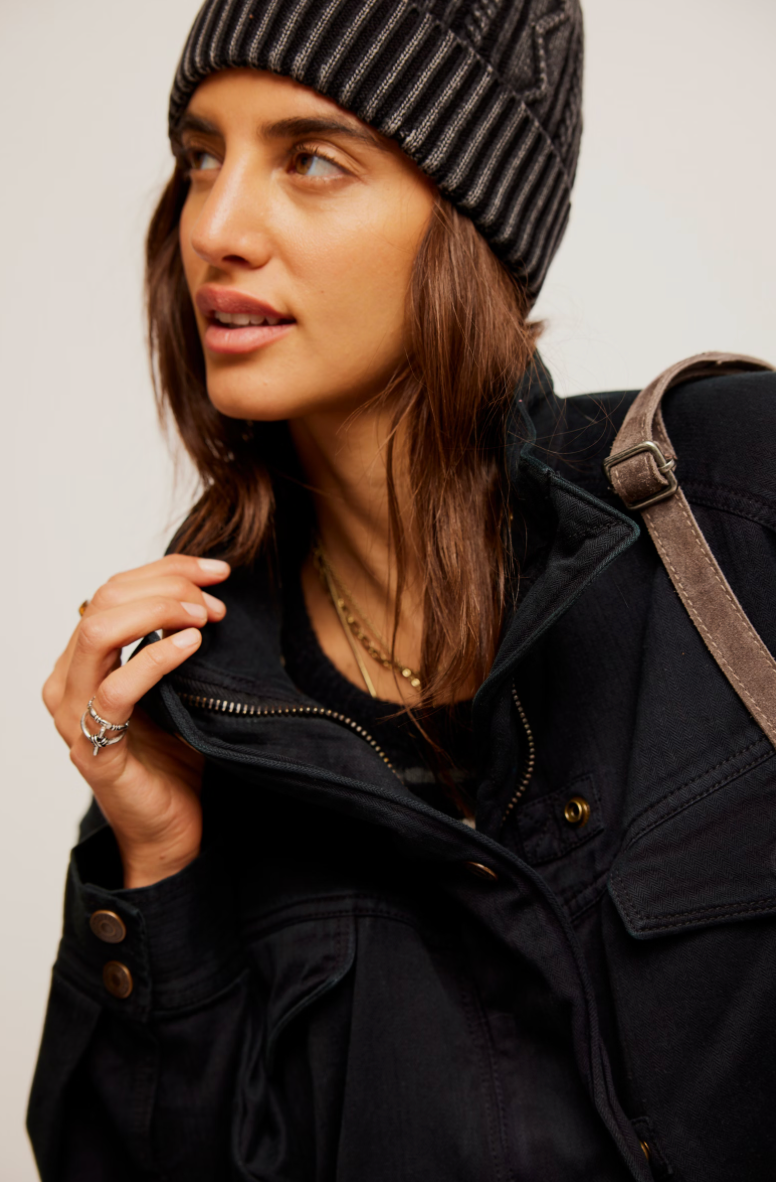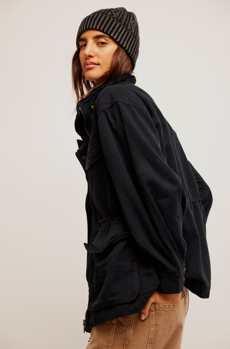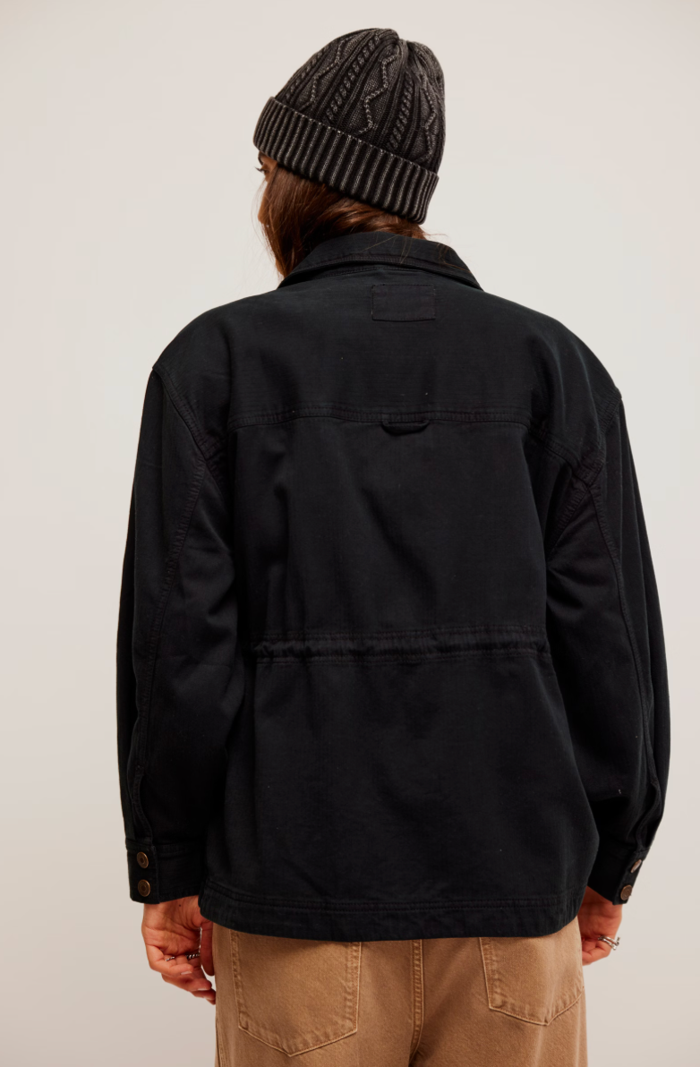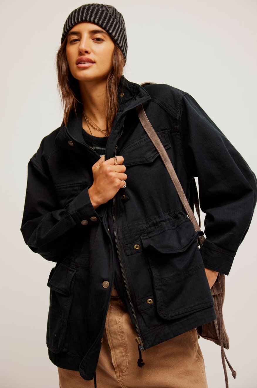 The Free People Arya Utility Jacket combines function and style with its safari-inspired design featuring multiple pockets, a cinched waist, and seamed details. Made from 100% cotton, this longline jacket also offers a comfortable fit with a stand collar and adjustable drawstring hem. A must-have essential for any jacket collection.