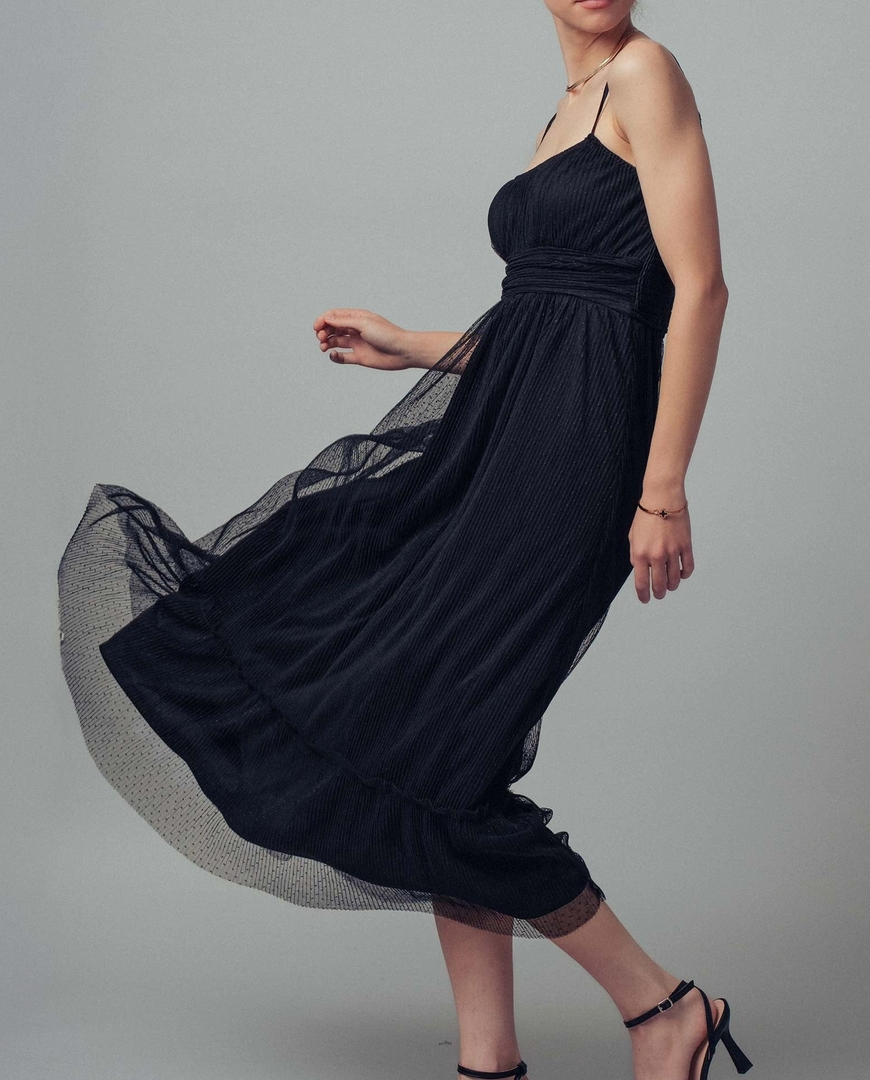Shimmer through the season in this striking black dress, a holiday ready statement piece designed for festive nights and sparkling celebrations. - Deep black hue with a subtle textured dot pattern that catches the light beautifully - Slim spaghetti straps and a square neckline for a sleek, feminine look - Cinched ruched waistband that defines the waist while adding a touch of elegance - Flowing sheer overlay skirt with ruffle hem detail, creating graceful, eye catching movement - Lightweight yet luxe fabric that drapes effortlessly, perfect for party sparkle *Fit: Fitted at the bodice with a flowing A line skirt for ease and drama. 100% Polyester