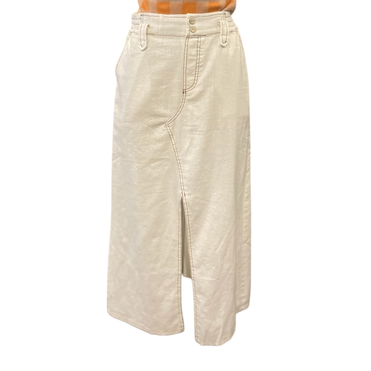 | - maxi skirt - washed linen fabric - contrast stitch - slit front - elastic waistband - side pockets - fully lined - zip and button closure |