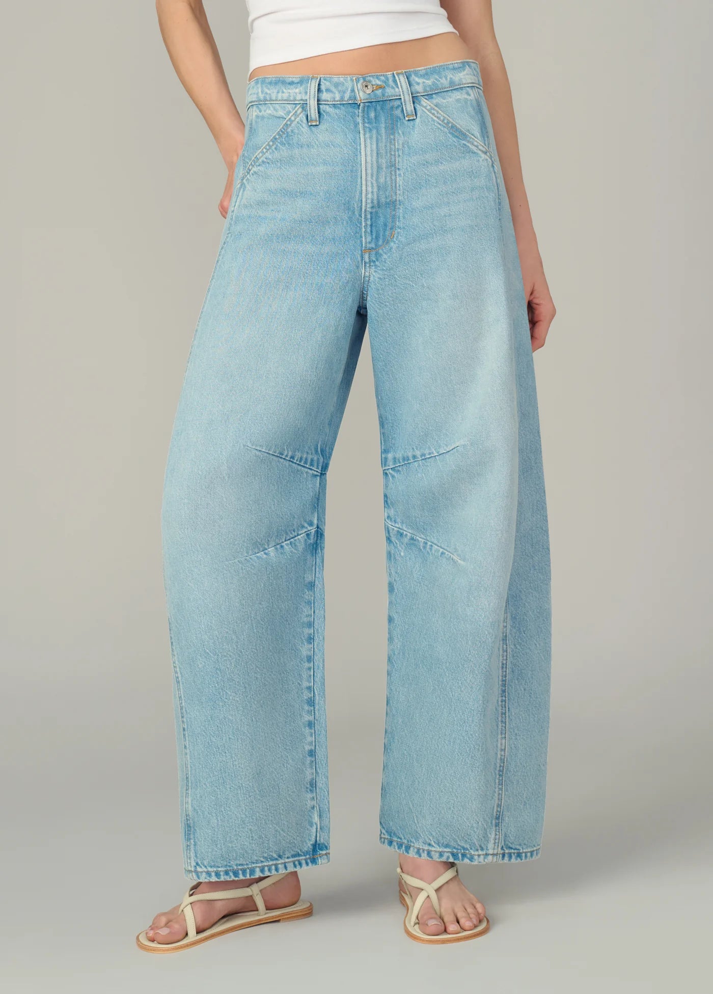 A horseshoe-shaped jean that has a relaxed rise that sits at the waist with an easy hip and exaggerated leg shape that hits at the ankle.