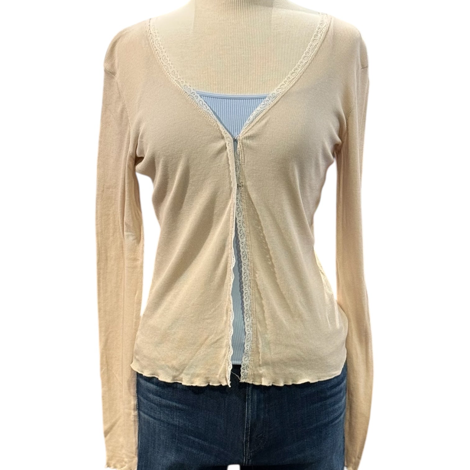 This feminine v-neck cardigan is ideal as a stand alone or paired with our Miley matching tank. With delicate lace trim and in our soft Supima rib fabric, this lightweight cardigan has a partial button closure and a sweet lettuce hem.
