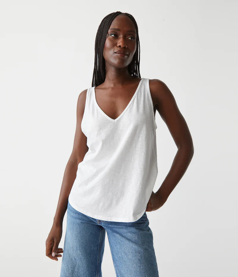 With a v-neck in the front and back, Scarlett is an easy fitting tank made from eco-friendly SUPIMA® Cotton Slub that is lightweight and breathable.