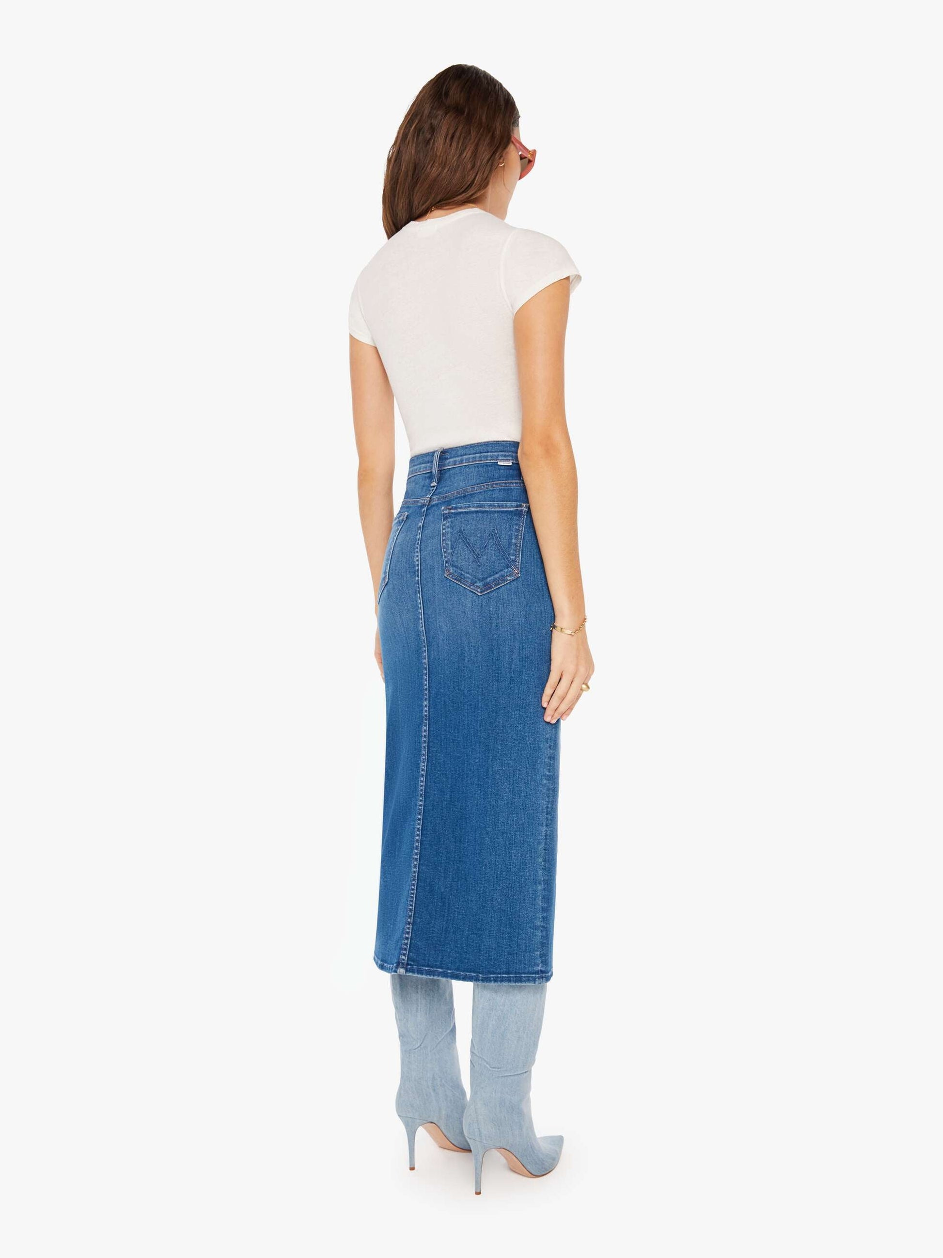 You know hue. A denim pencil skirt with a high rise, narrow fit and a thigh-high front slit. Cut from stretch denim, Hue Are You? is a mid-blue wash with whiskering and subtle fading.