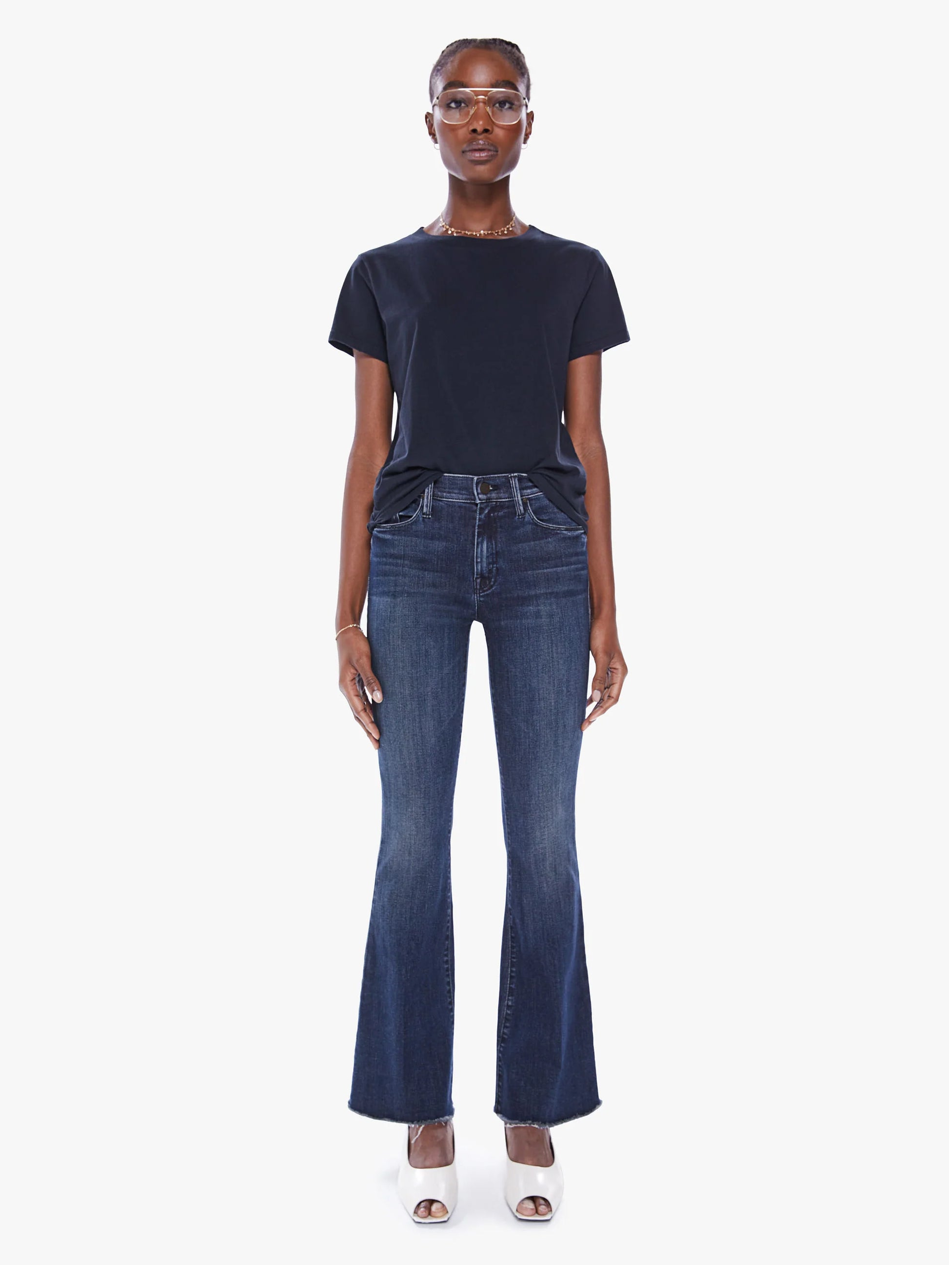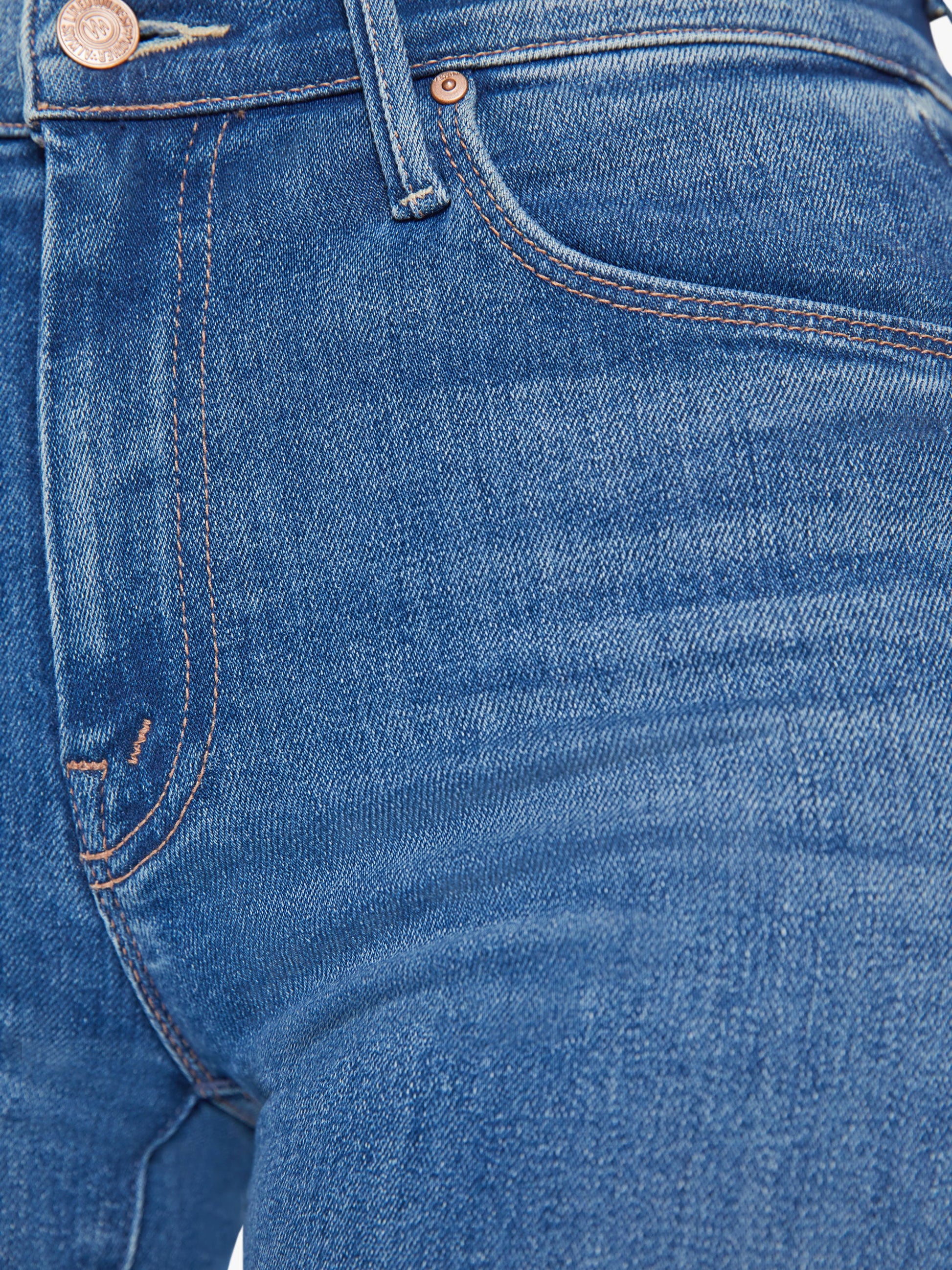 Groovy. This cult-favorite flare jean has a high rise with a 31-inch length inseam and a frayed hem. Crafted from soft stretch denim in a medium blue wash with subtle fading and whiskering.