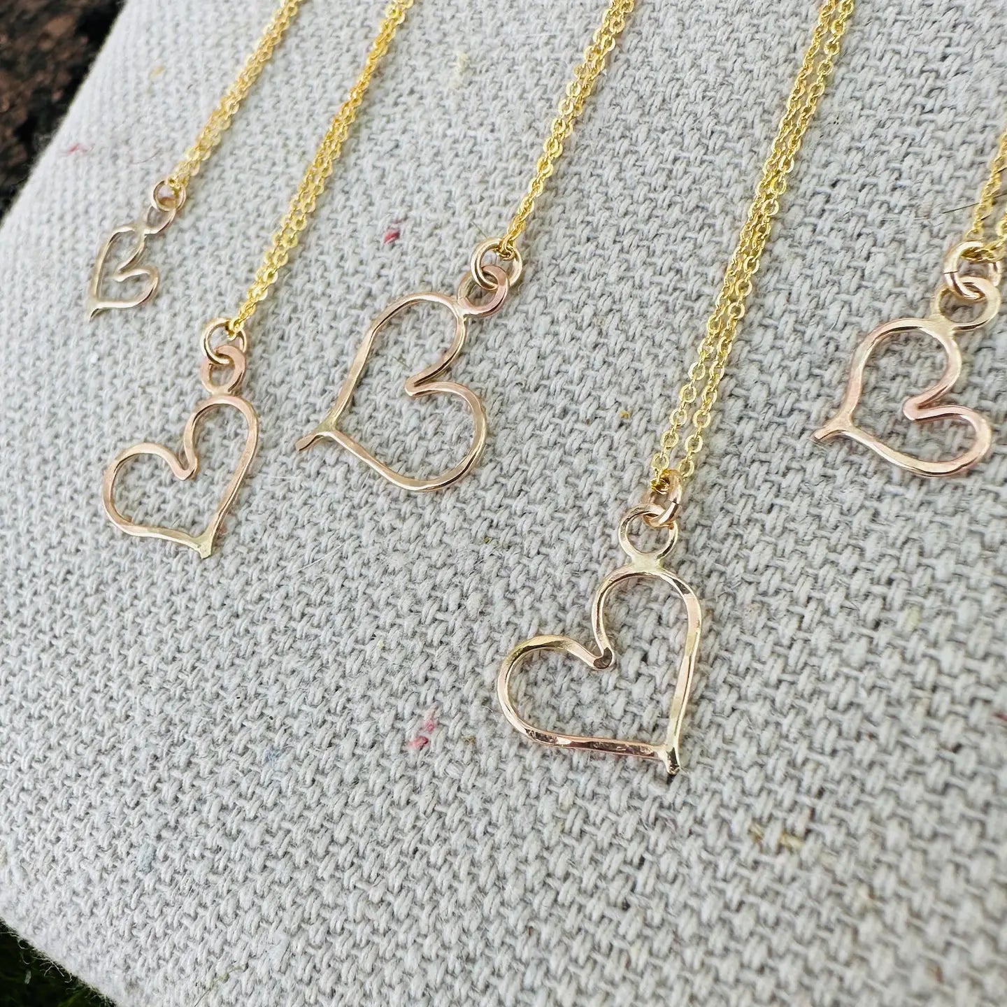 These perfectly-imperfect sweetheart necklaces are an absolute favorite. Handcrafted in 14k Gold Fill or Sterling Silver, these delicate hearts hang from your choice of 14k Gold Fill, Gold Plated Brass or Sterling Silver Chain. Each heart is unique, just like yours. Hearts measure approximately 1/2'' across and hang from your choice of 16" or 18" chain.