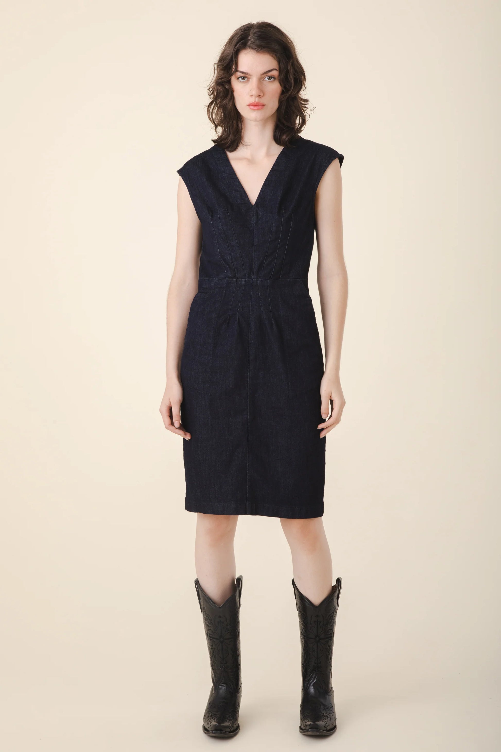 While Bourbon Street has no dress code, travel guides suggest durable, casual clothing with sex appeal. This tailored, form-fitting denim dress will roll up into your suitcase and disappear into any environment while you stand out. A flattering front and back V-neckline sits above the elliptical waistline, darted bodice and skirt, and secured side pockets. A classic, vintage-inspired dress for endless wear.