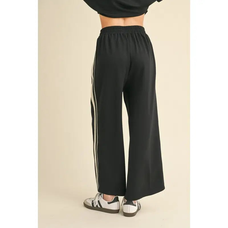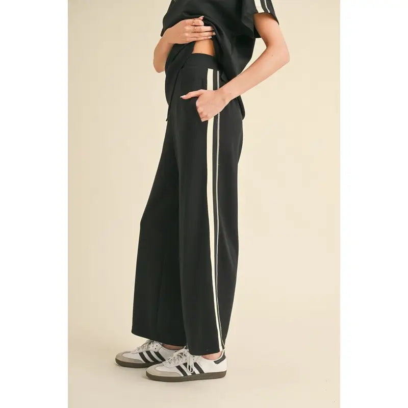 Striped Down Line Pants with Pockets - Solid pants with stretch-band waistline, side pockets and striped down line detailing. - Non-sheer, lightweight. - Model is 5'7'' and is wearing a Small. - 50% RAYON 45% POLYESTER 5% SPANDEX