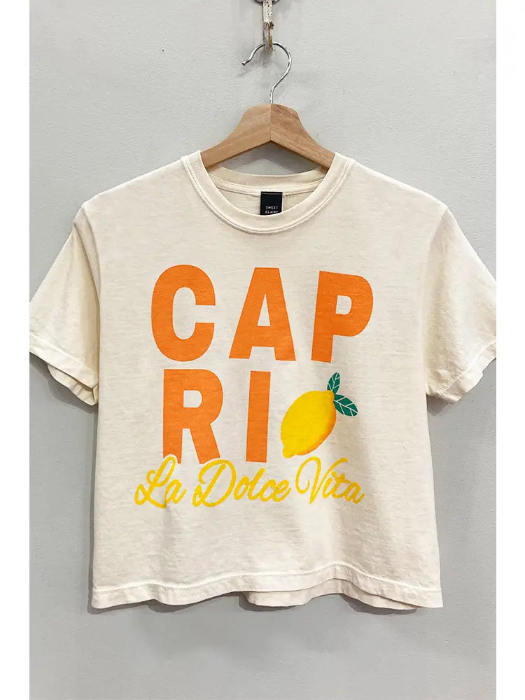 Short sleeve cropped-length garment-dyed heavyweight cotton "capri-la dolce vita" graphic tee; made in USA
