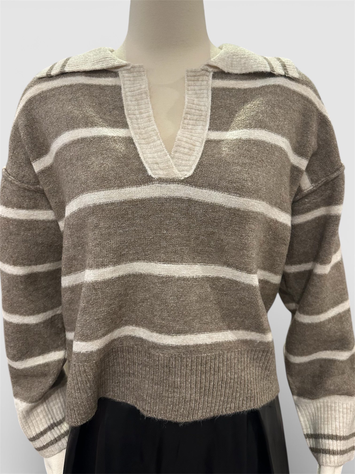 Knit Sweater Acrylic Polyester Spandex Striped Collar V-Neck Long Sleeve Top