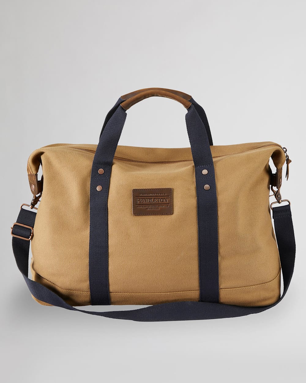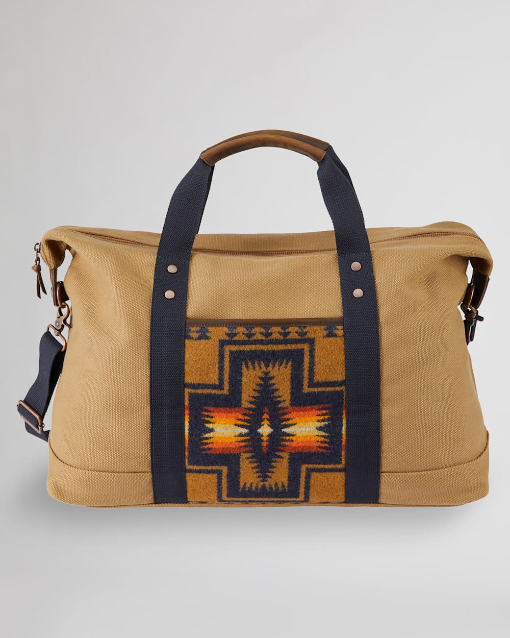 The perfect weekend getaway bag. Constructed with durable cotton and virgin wool woven in the USA. Equipped with convenient zipper closure, snap-down sides, exterior wool pocket, multiple interior pockets, top handle and an adjustable/removable crossbody strap. Fixed pattern placement.