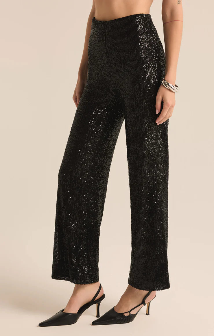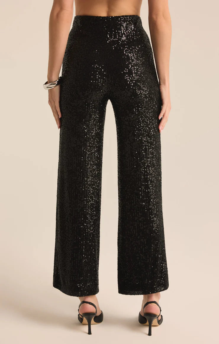 Elevate your style with ZSupply's Skylar Sequin Cropped Pant. This wide leg pant features a high rise and flit-and-flare design, perfect for adding a touch of glam to any outfit. Crafted from our Stretch Sequin fabric, this pant offers a comfortable fit with an elastic waistband and fully lined design. Machine washable for easy care.
